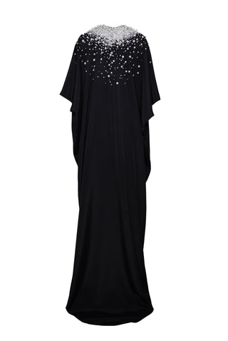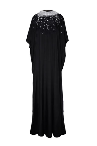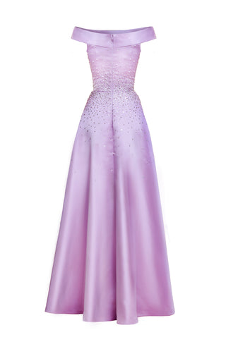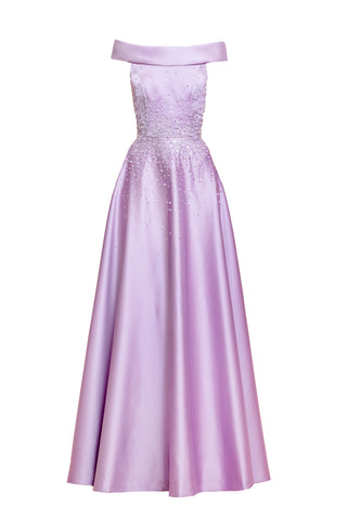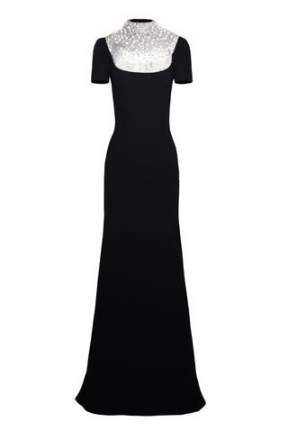 PEARL EMBELLISHED NECKLINE FIT-AND-FLARE GOWN WITH CAP SLEEVES