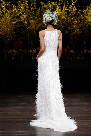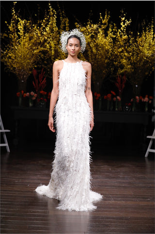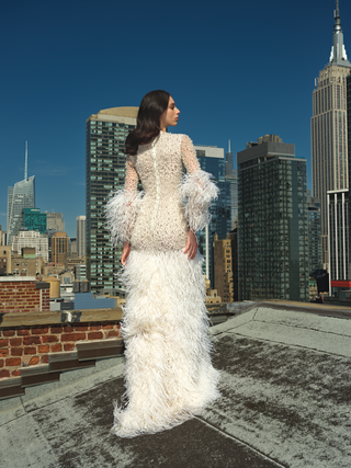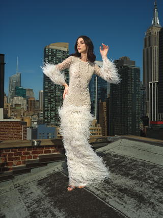 Petal Embroidered Long Sleeve Cocktail Dress and Feather Shawl