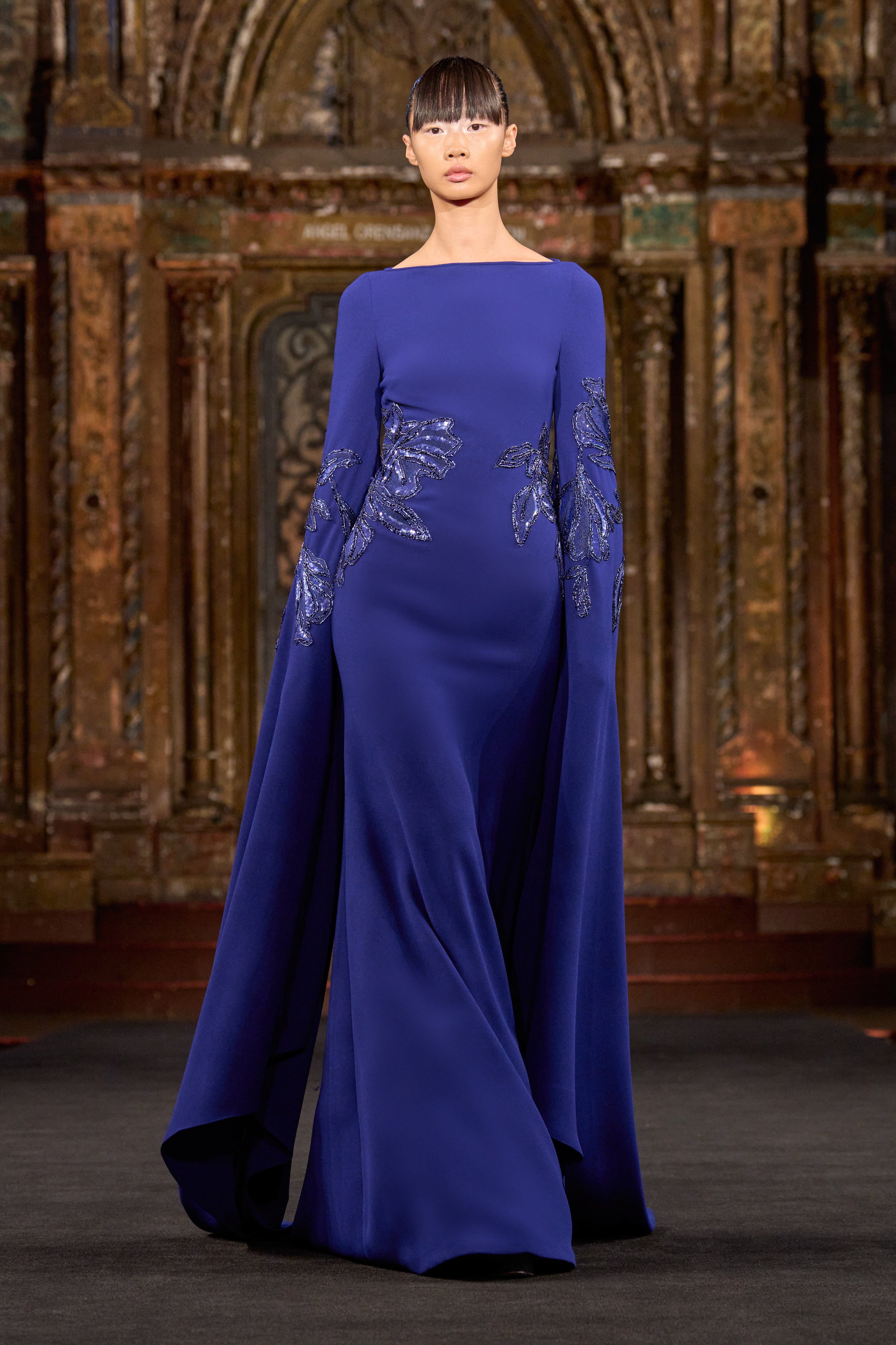 CREPE BOAT NECK CASCADING SLEEVE GOWN