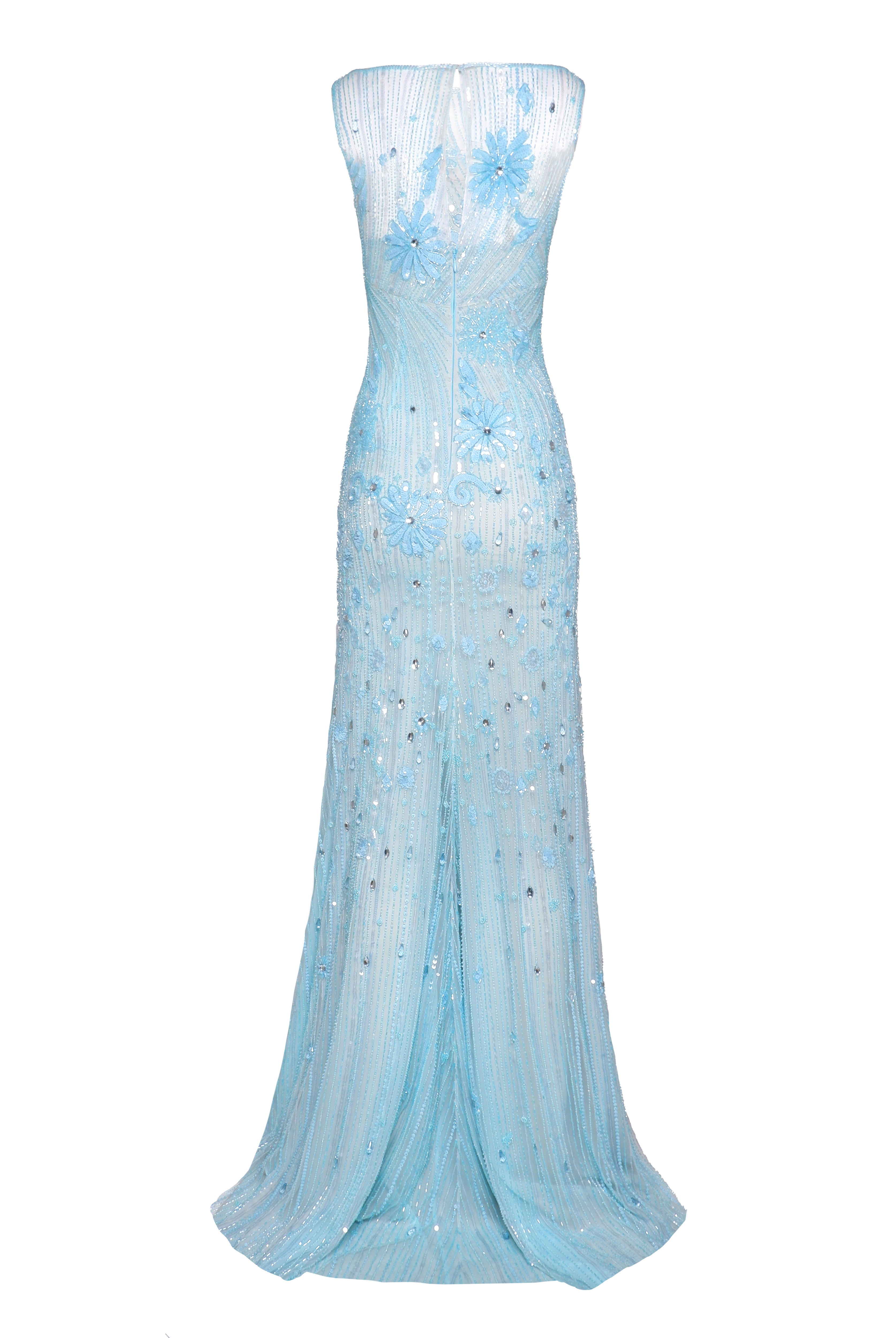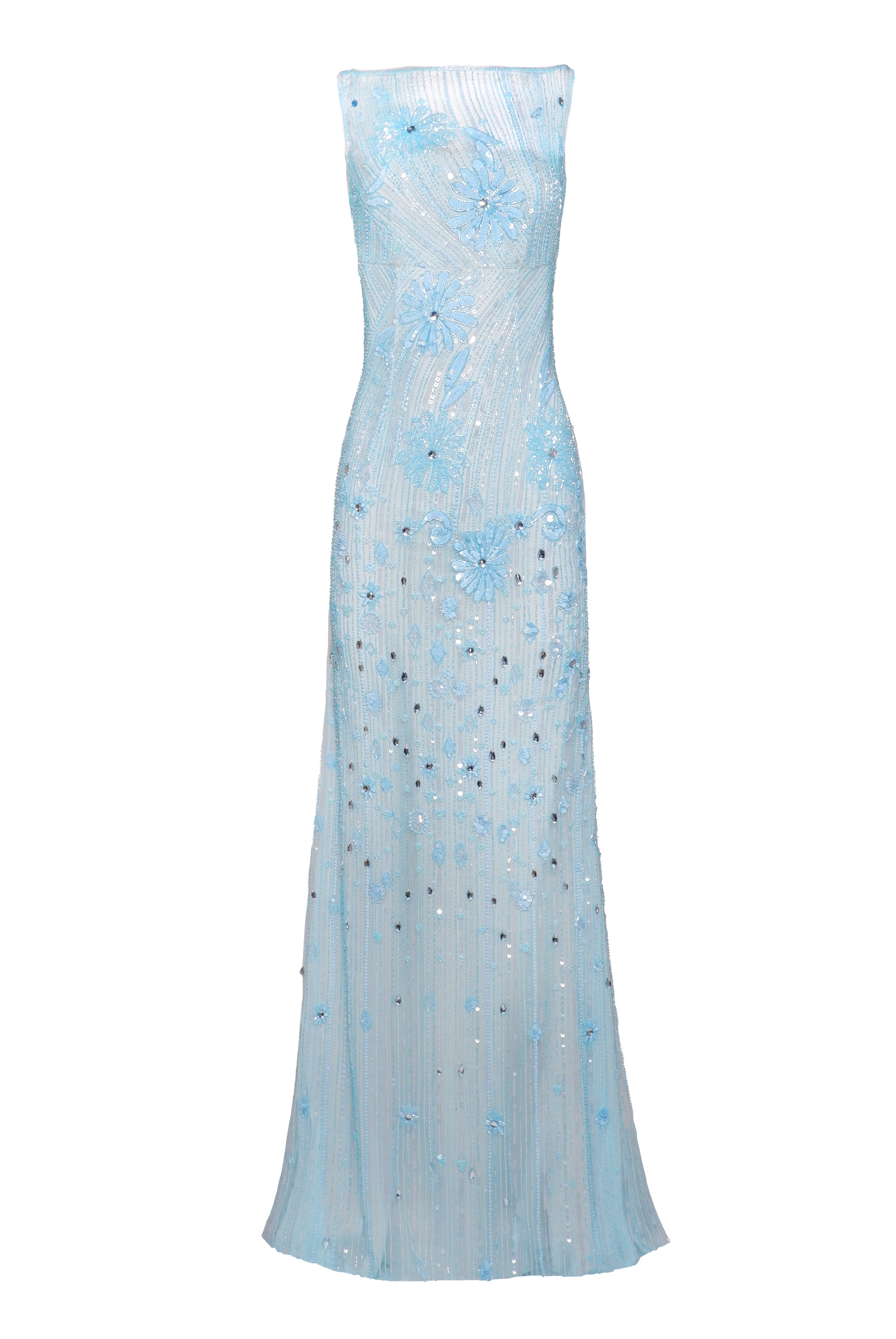 FLORAL BEADED BOATNECK FIT-AND-FLARE GOWN