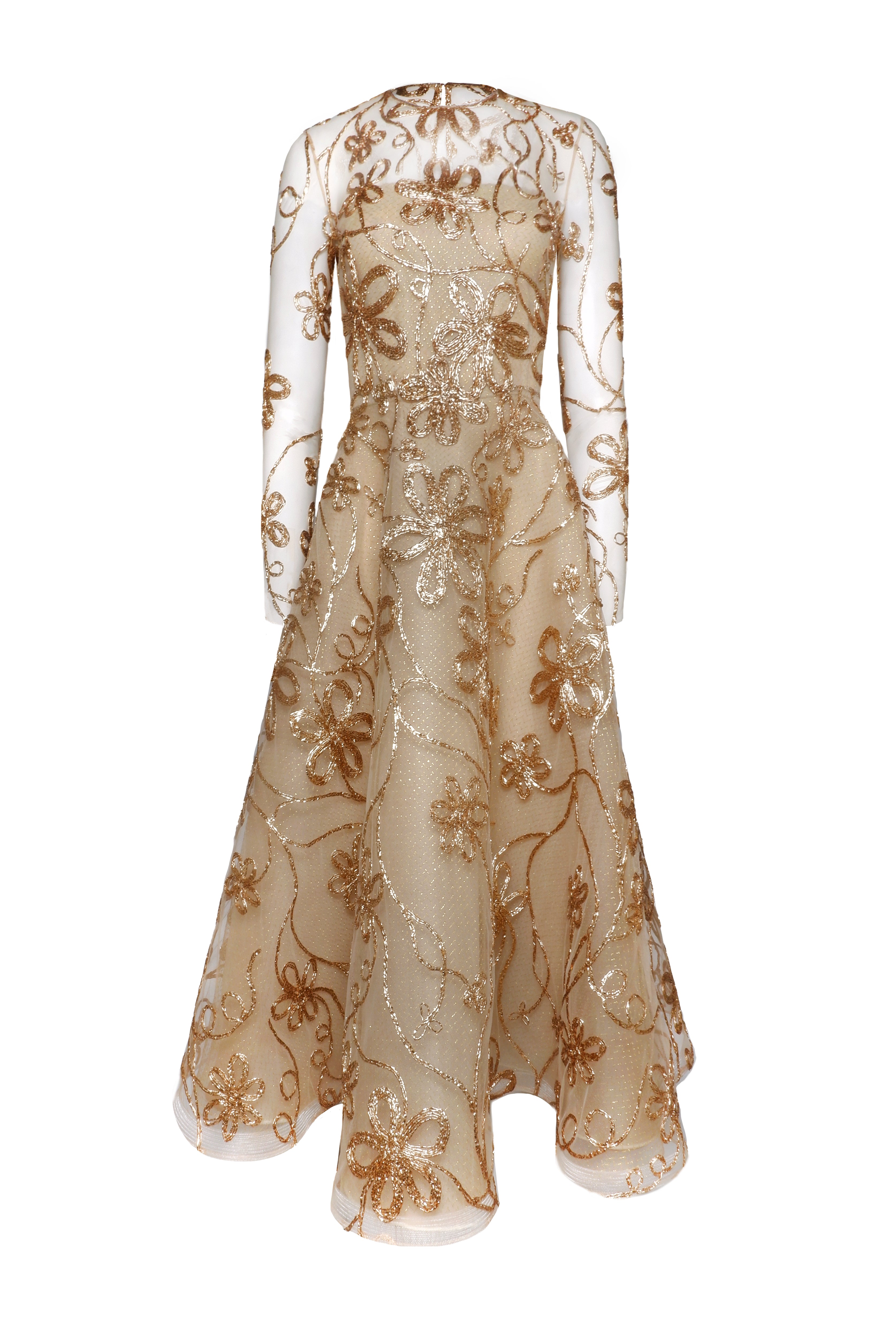 METALLIC RAFFIA LONG SLEEVE TEA-LENGTH DRESS