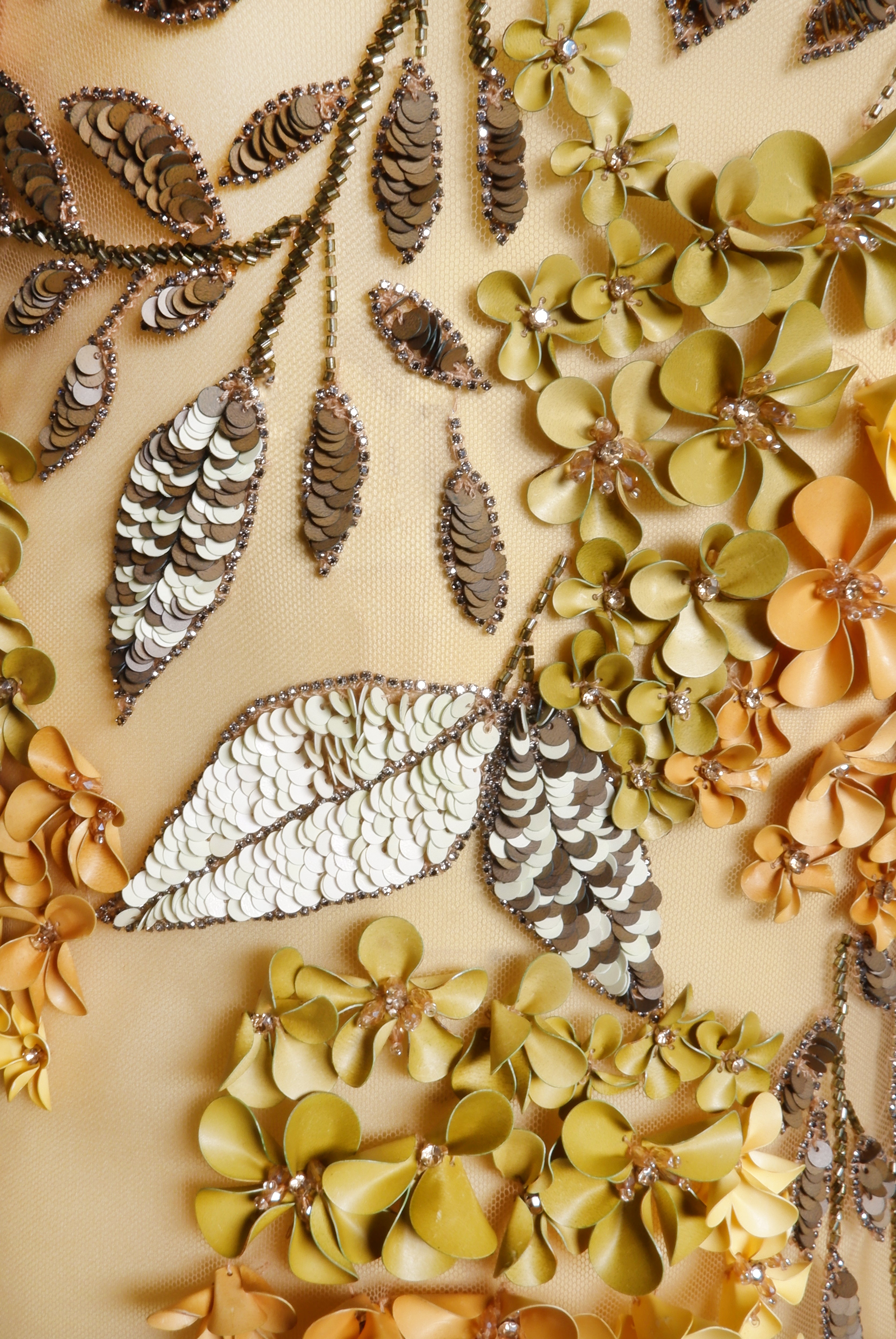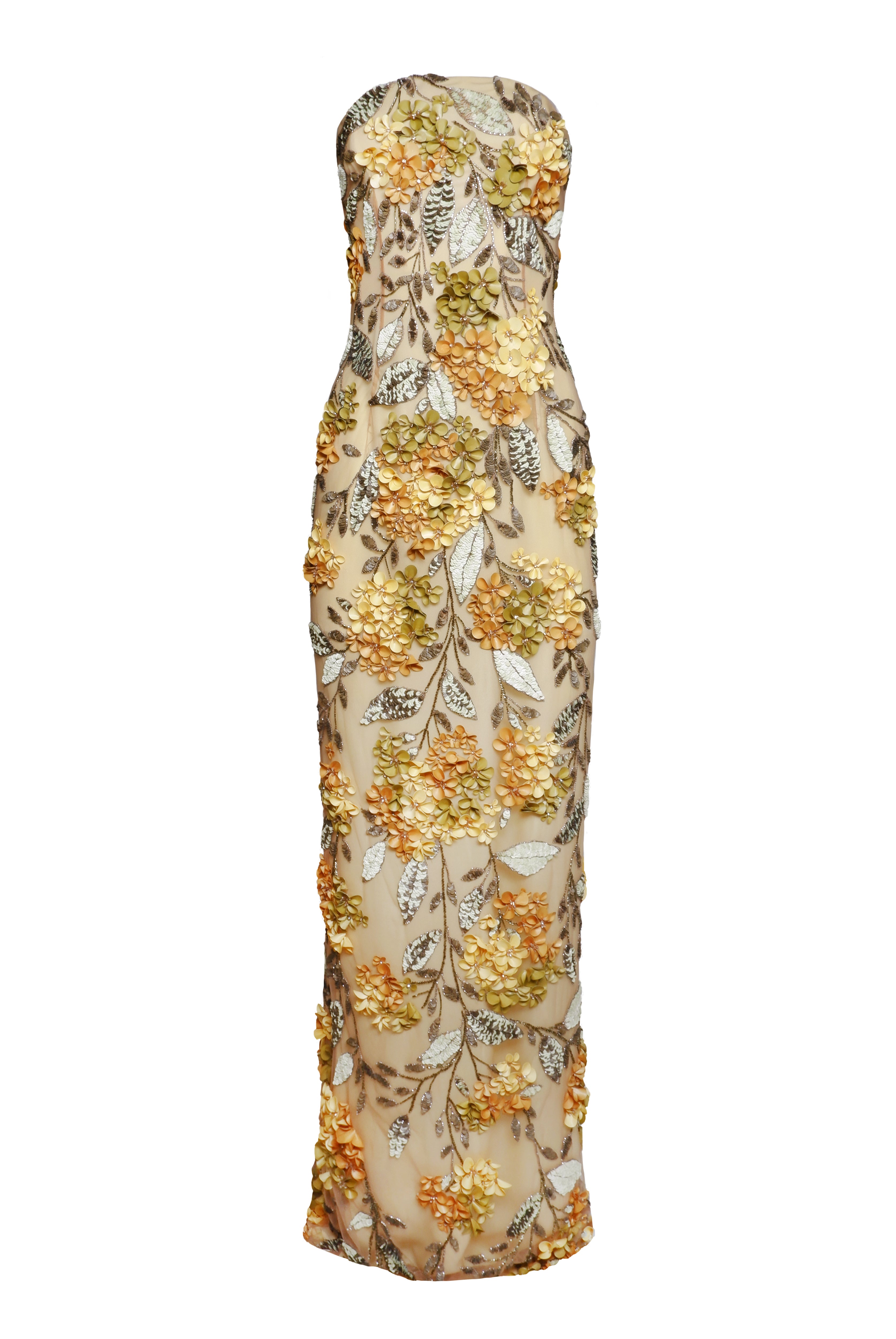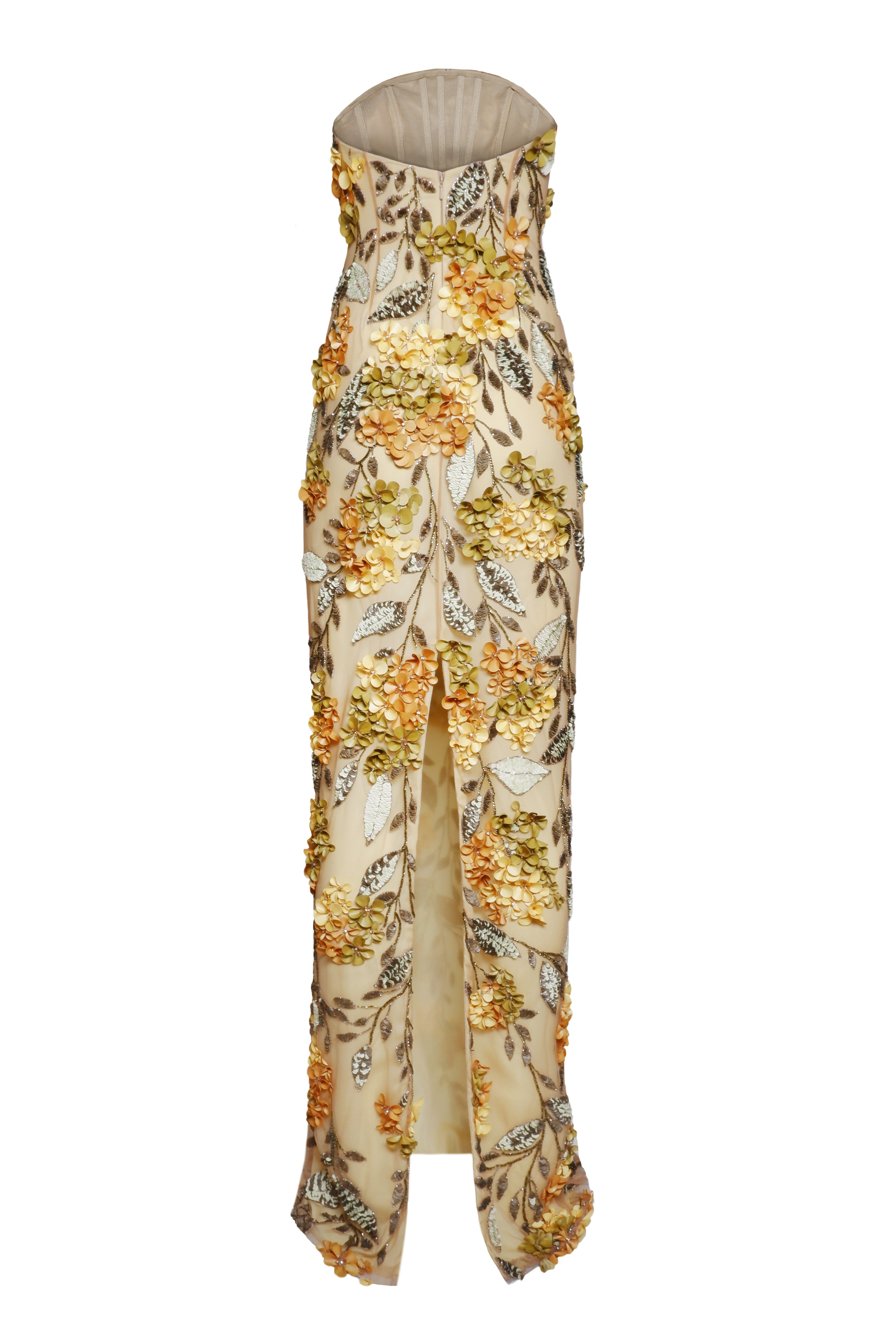 FLORAL EMBELLISHED STRAPLESS COLUMN GOWN