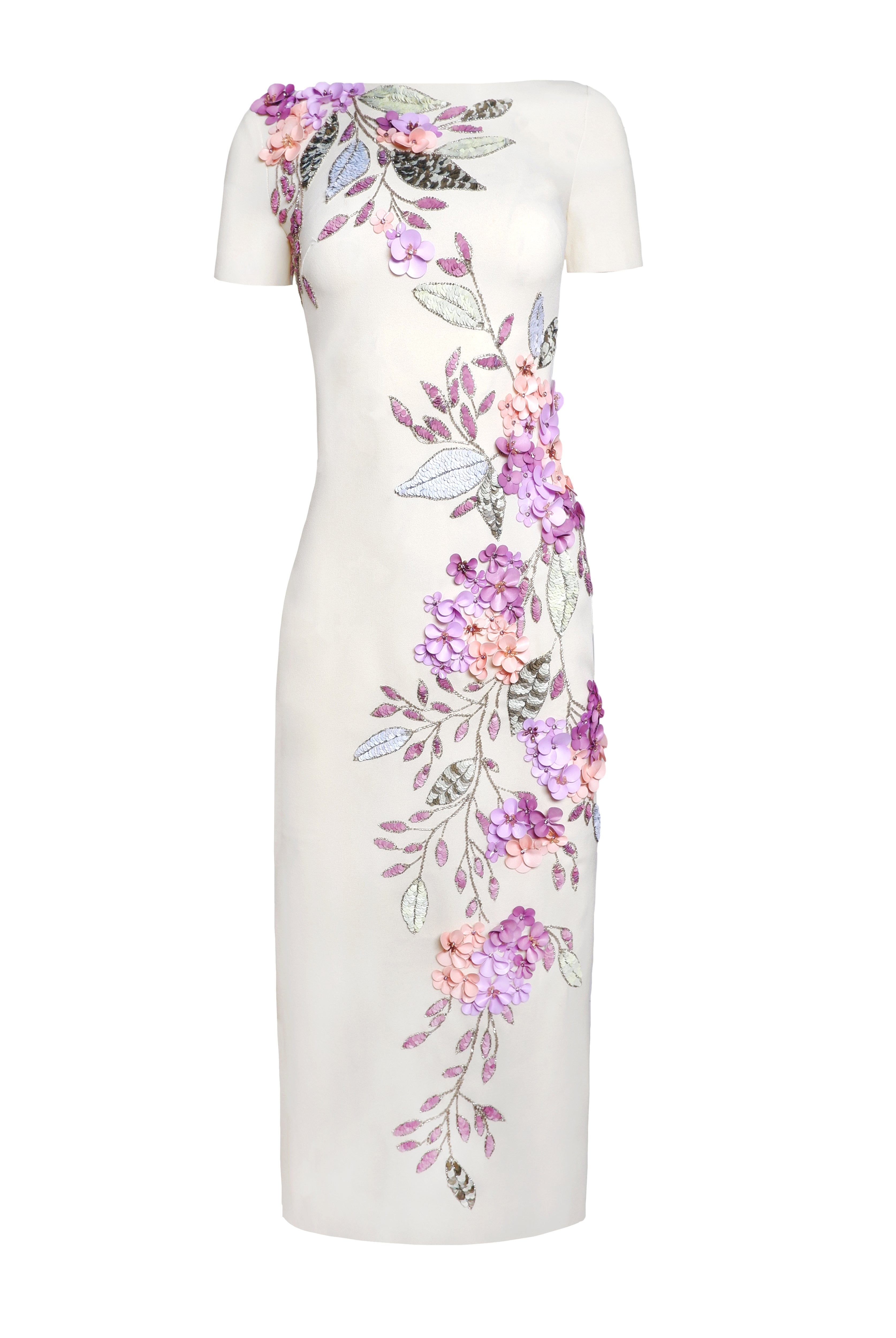 FLORAL EMBELLISHED BOAT NECK TEA-LENGTH DRESS