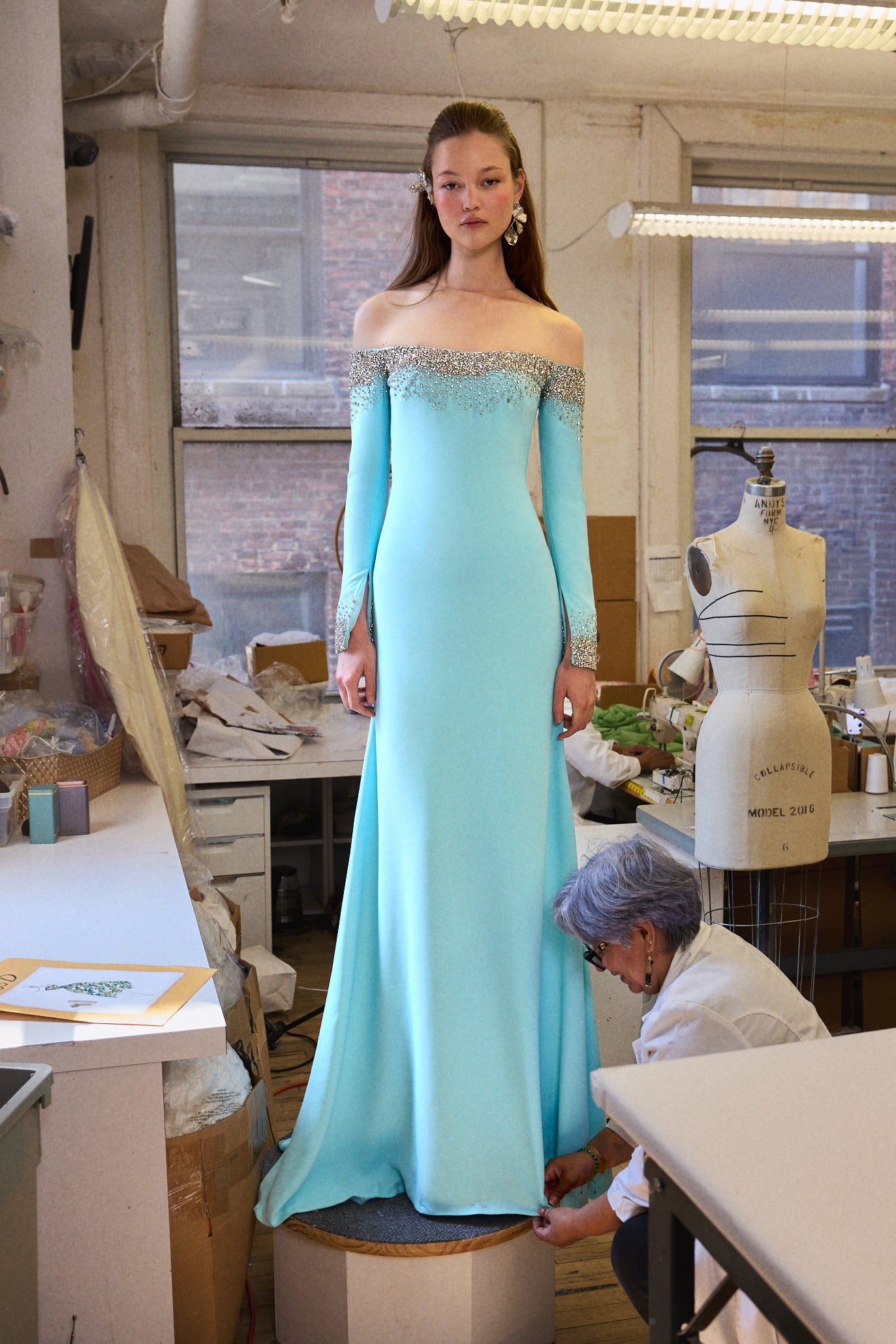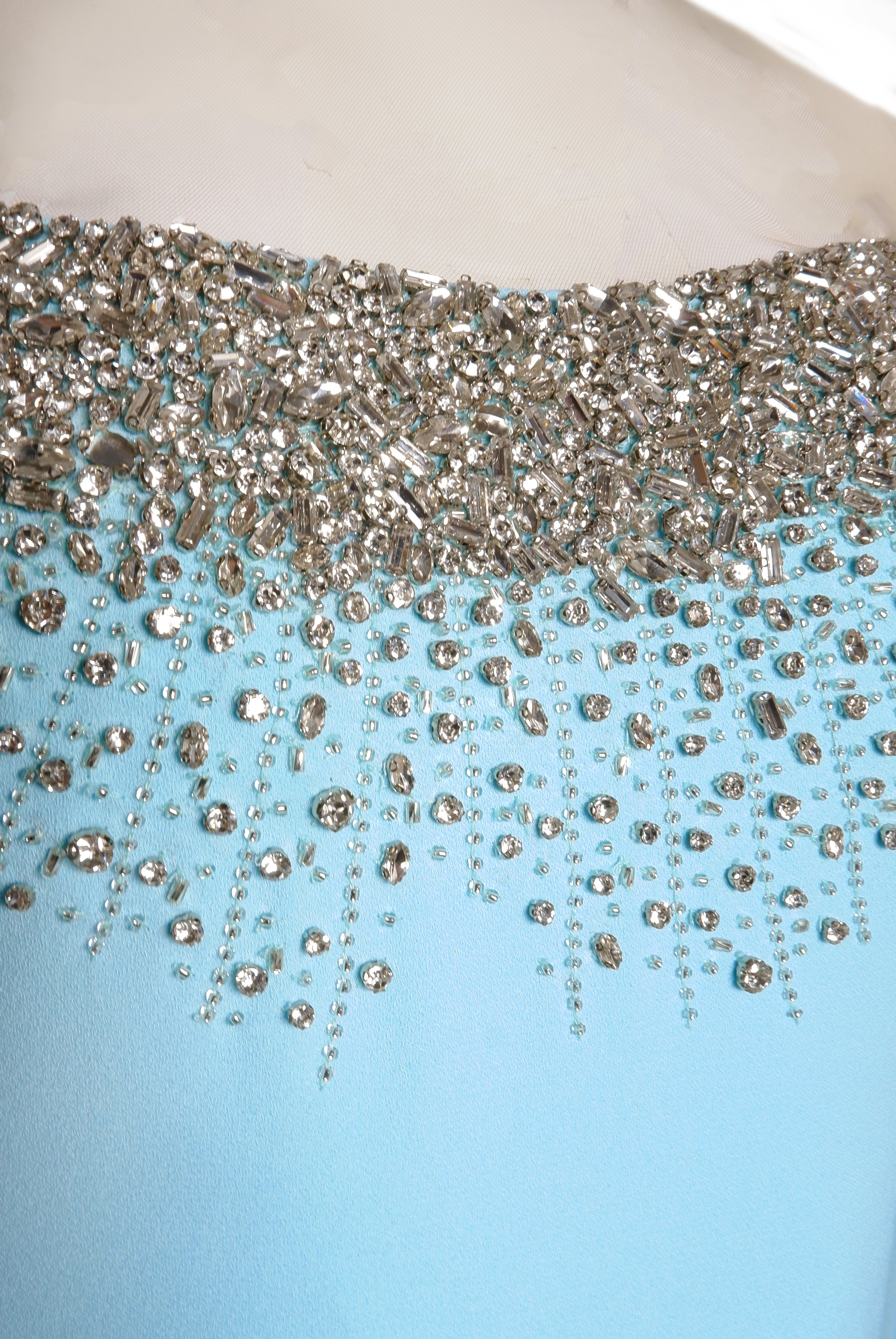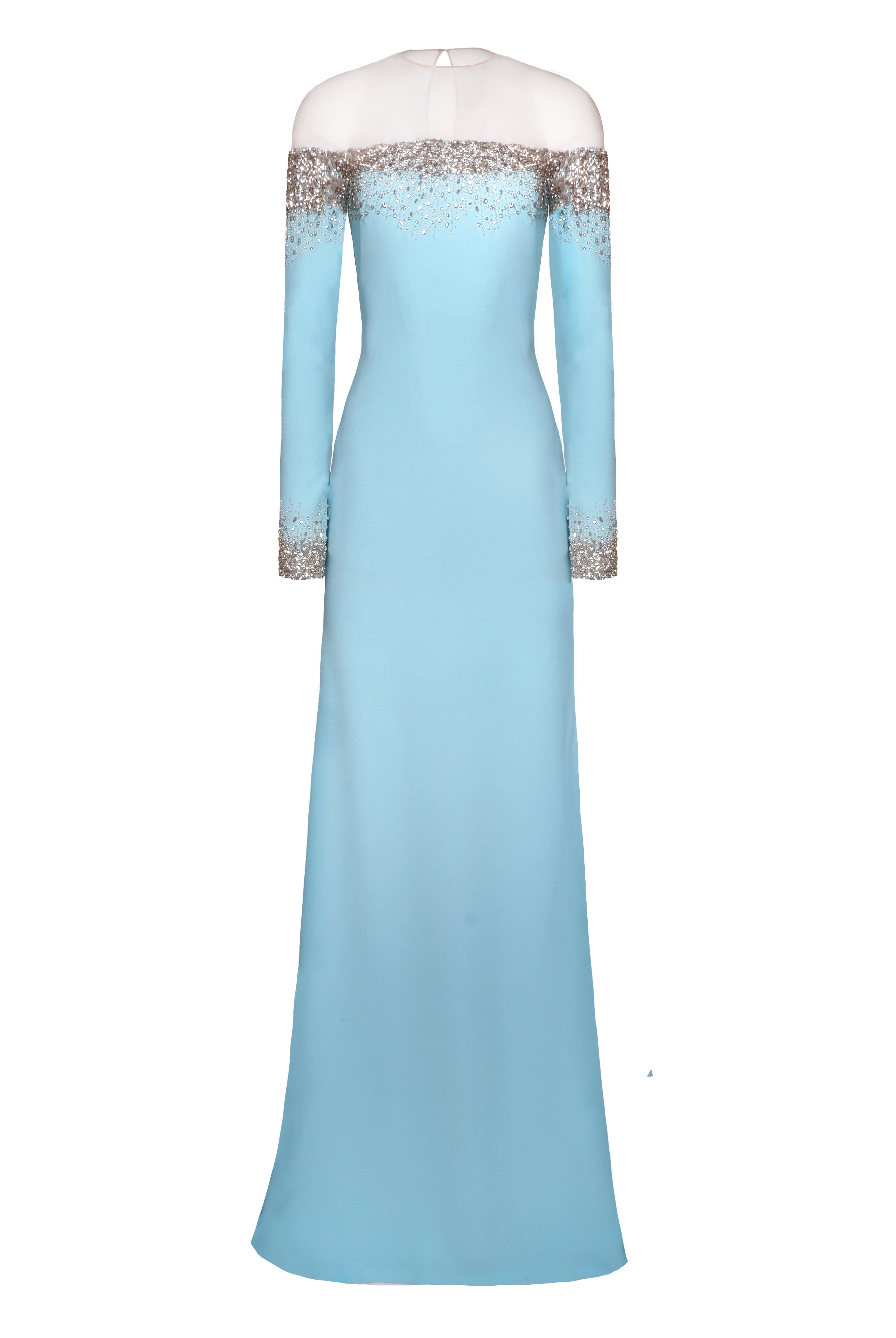 CRYSTAL EMBELLISHED ILLUSION NECKLINE FIT-AND-FLARE GOWN