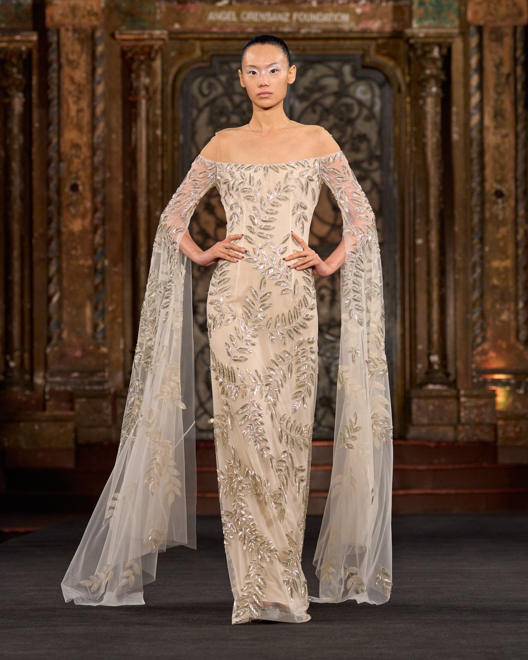 ILLUSION NECKLINE FIT AND FLARE GOWN W/ CASCADING SLEEVES