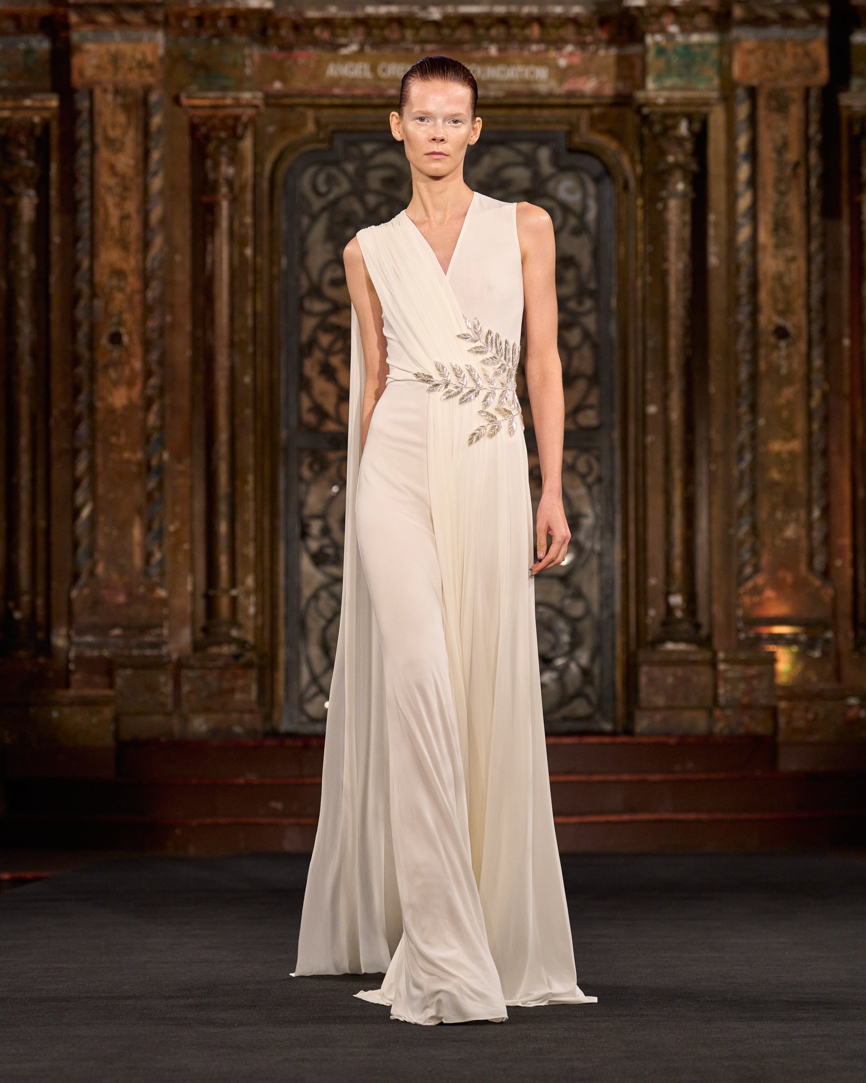 DRAPED V-NECK GOWN WITH EMBELLISHED LEAF DETAIL